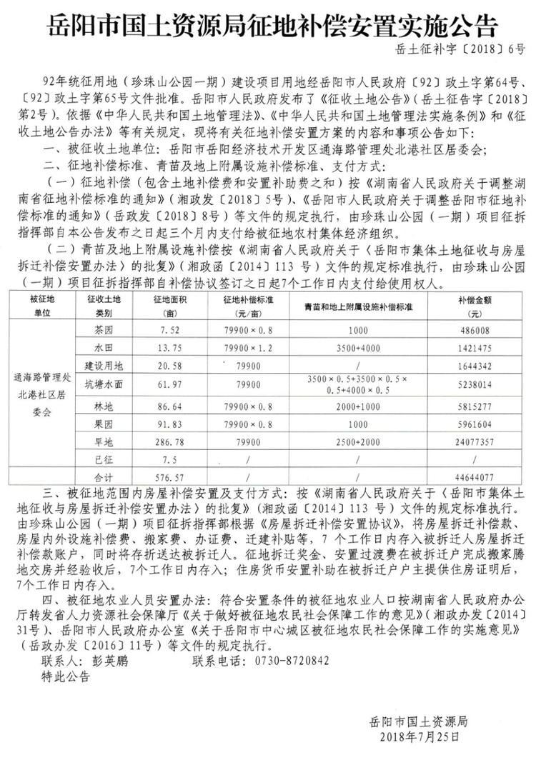 92年统征用地(珍珠山公园一期)项目征地补偿安置实施公告〔2018〕6号