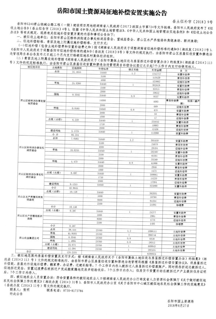 岳阳市G240君山绕城公路工程(一期)用地项目征地补偿安置实施公告〔2018〕9
