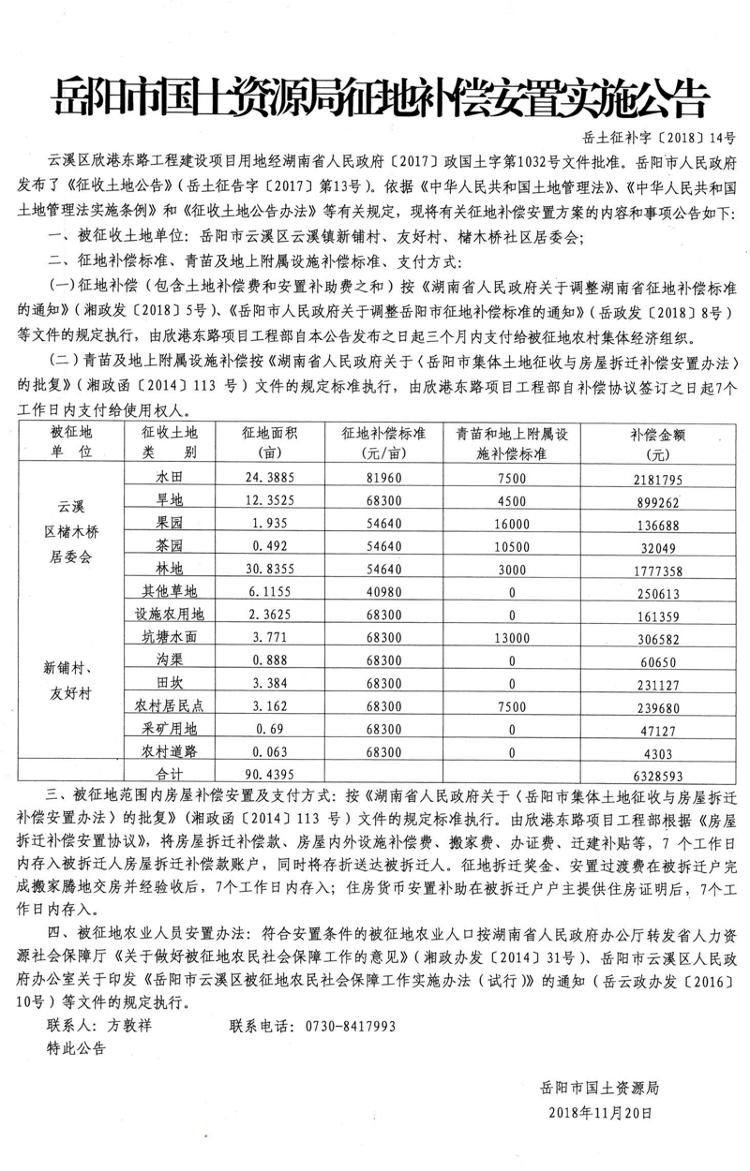 云溪区欣港东路工程用地项目征地补偿安置实施公告岳土征补字〔2018〕14号