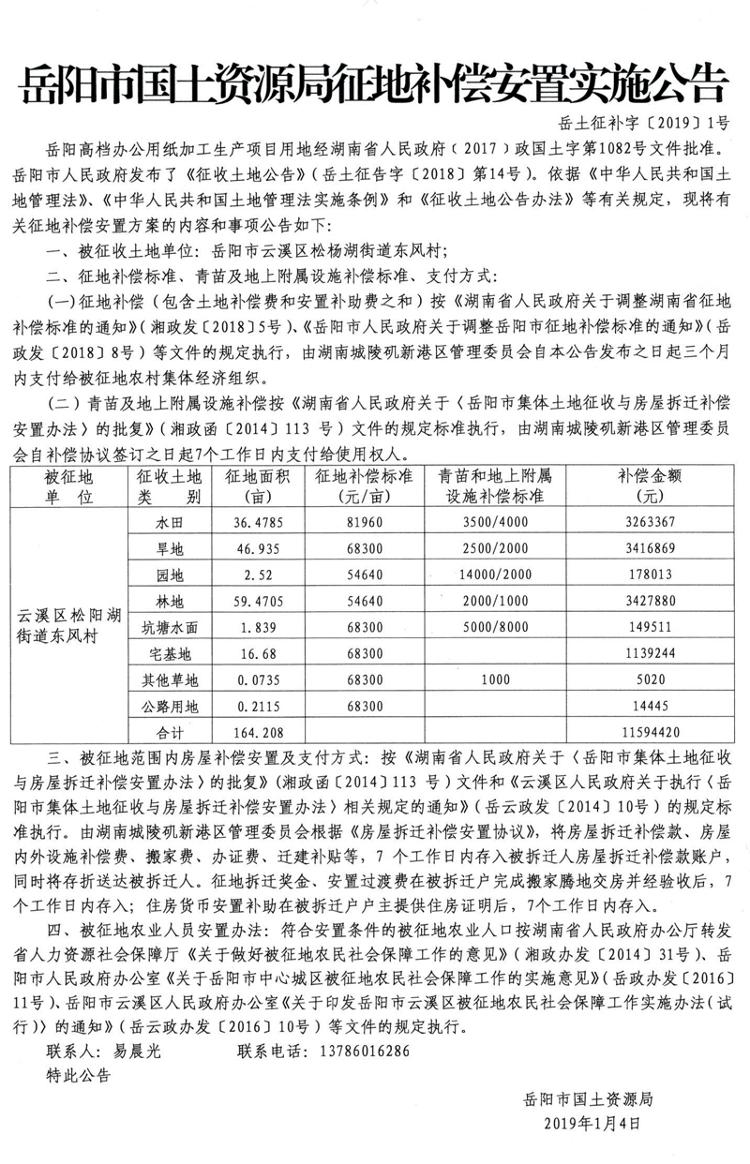 岳阳高档办公用纸加工生产项目征地补偿实施公告〔2019〕1号