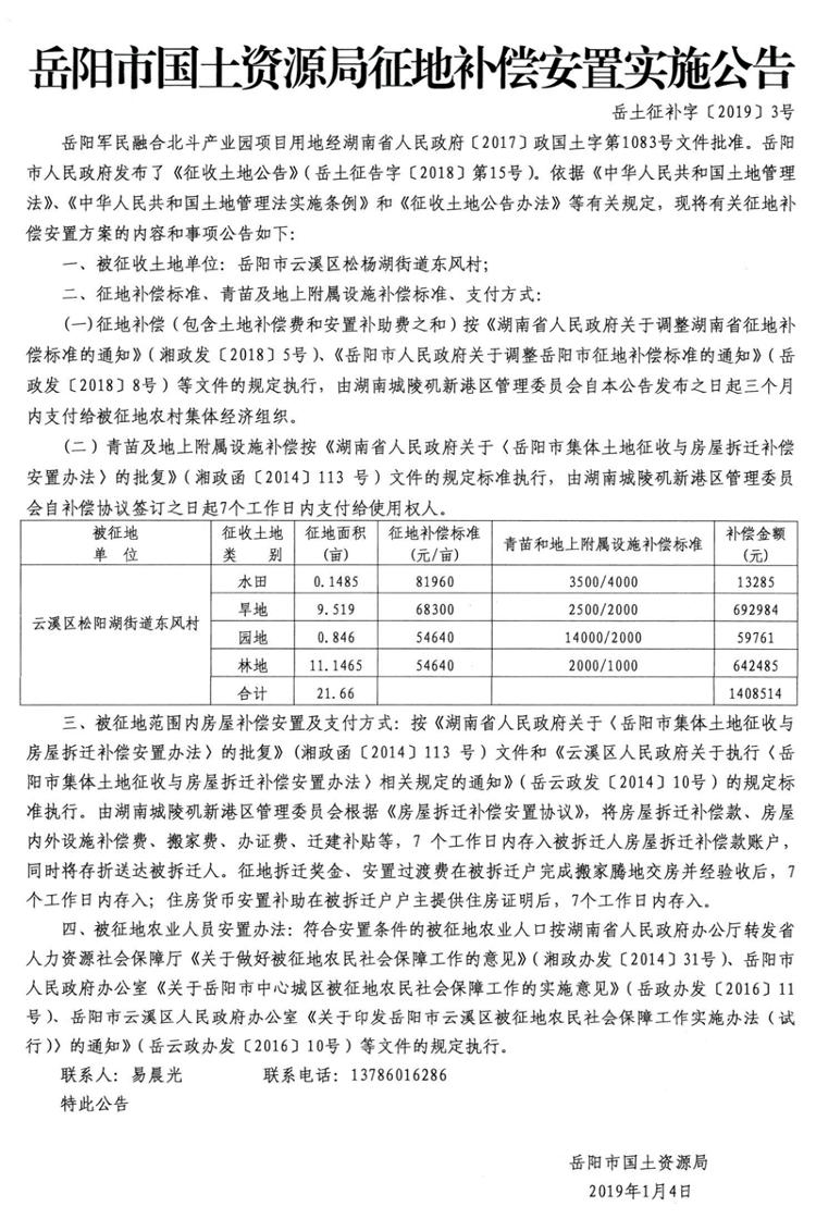 岳阳军民融合北斗产业园项目征地补偿实施公告〔2019〕3号