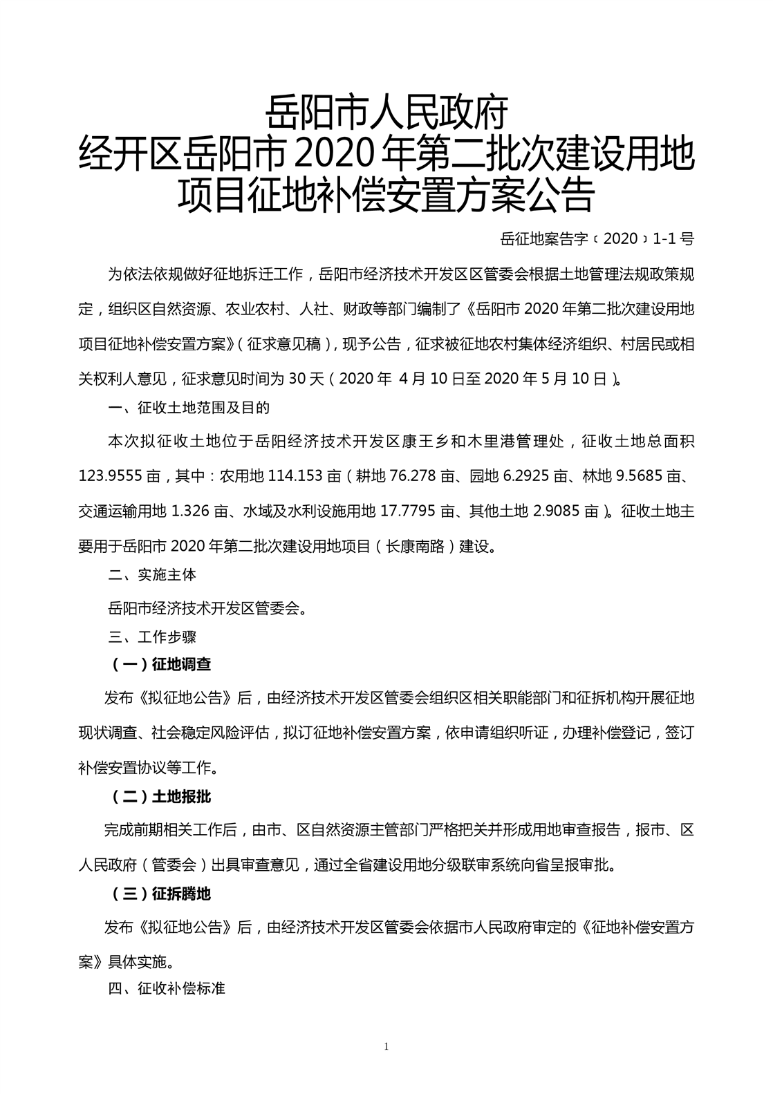 经开区岳阳市2020年第二批次建设用地项目征地补偿安置方案公告 岳征地案告字﹝2020﹞1-1号