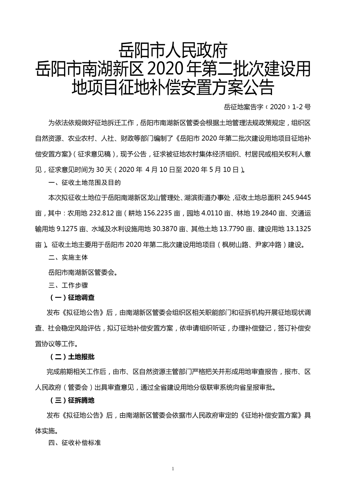 岳阳市南湖新区2020年第二批次建设用地项目征地补偿安置方案公告 岳征地案告字﹝2020﹞1-2号