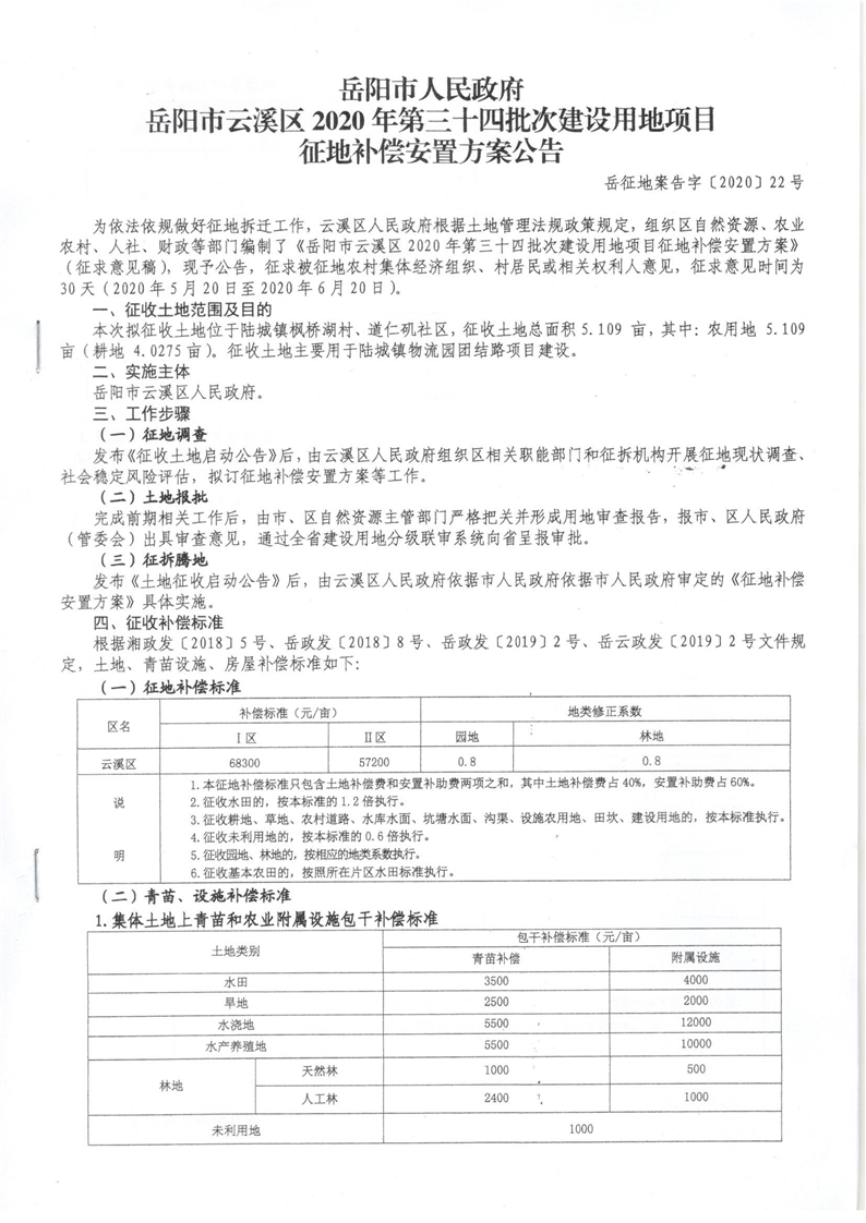 岳阳市云溪区2020年第三十四批次建设用地项目征地补偿安置方案公告