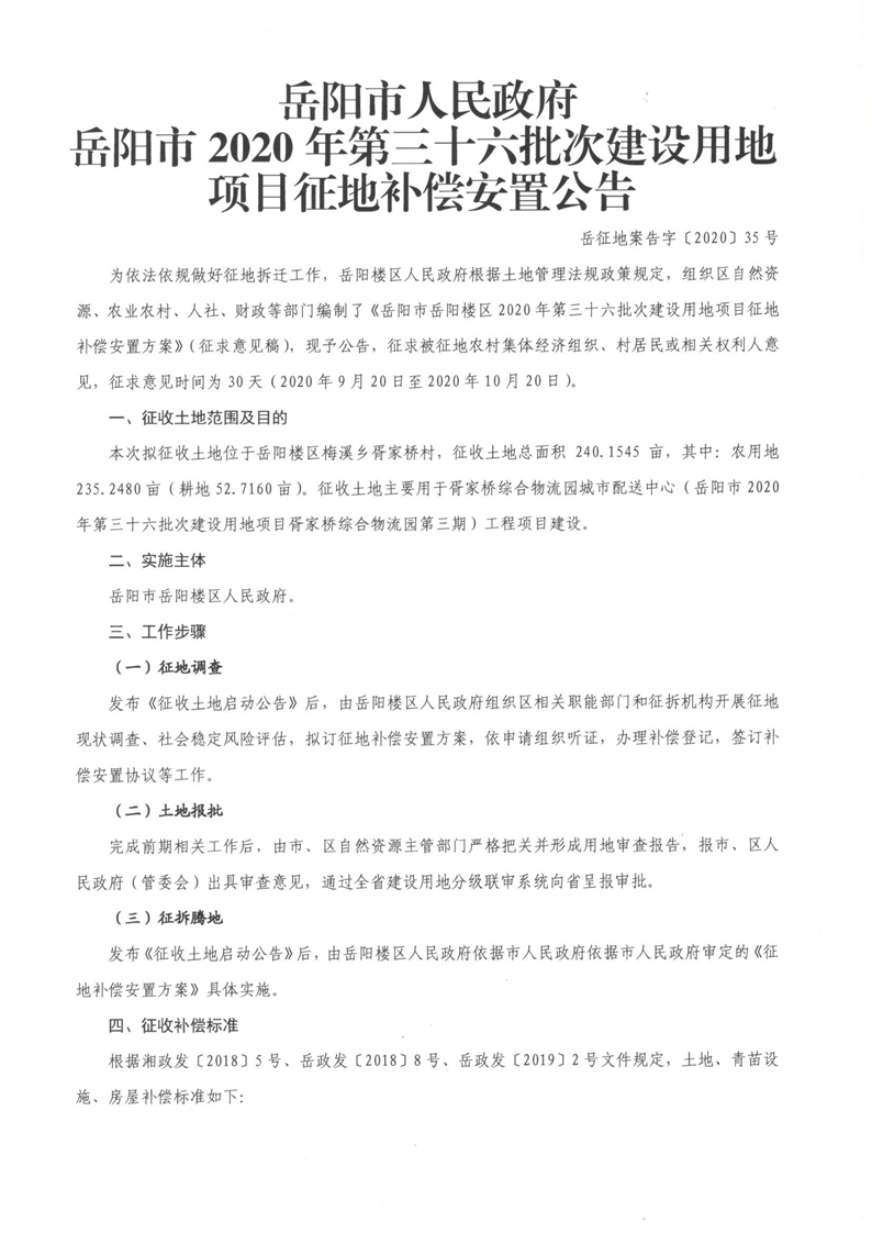 岳阳市2020年第三十六批次建设用地项目(楼区)征地补偿安置公告