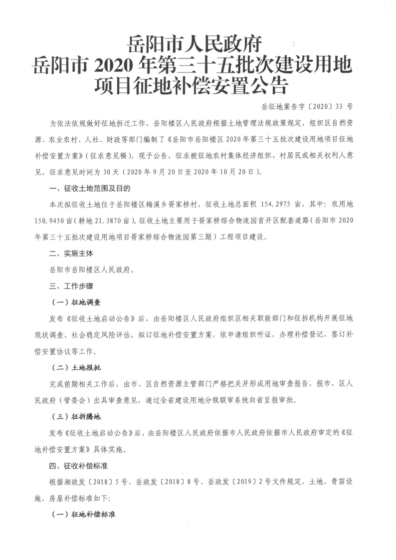 岳阳市2020年第三十五批次建设用地项目(楼区)征地补偿安置公告