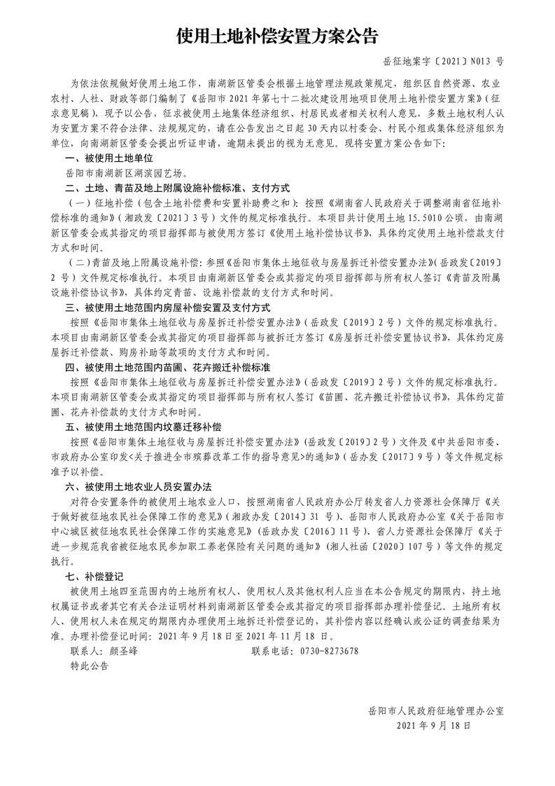 岳阳市2021年第七十二批次建设用地项目使用土地补偿安置方案公告
