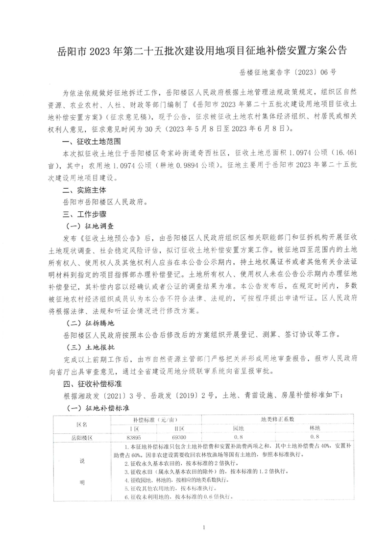 岳阳市2023年第二十五批次建设用地项目征地补偿安置方案公告