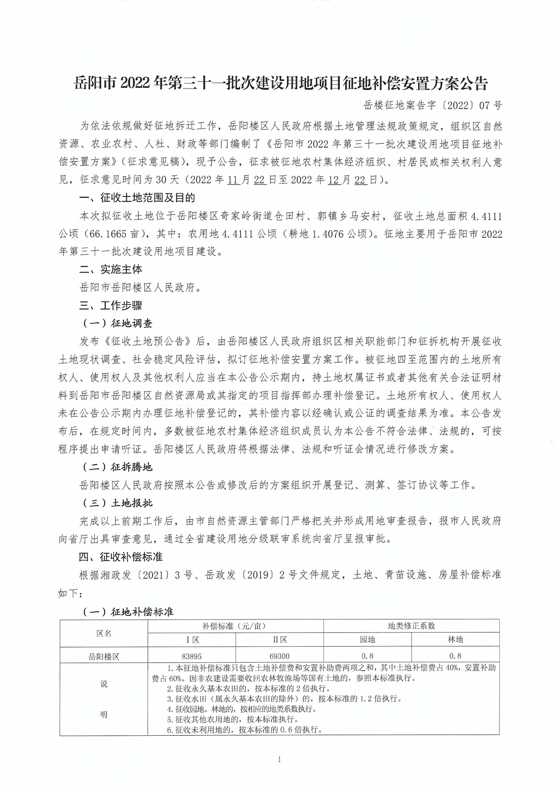 岳阳市2022年第三十一批次建设用地项目征地补偿安置方案公告