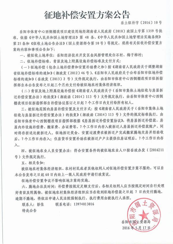 岳阳市国土资源局征地补偿安置方案公告|岳土征补字〔2016〕10号