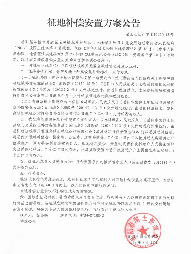 岳阳市国土资源局征地补偿安置方案公告|岳土征补字〔2016〕13号