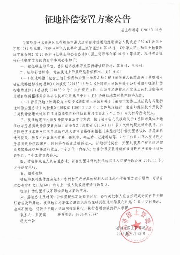 岳阳市国土资源局征地补偿安置方案公告|岳土征补字〔2016〕15号