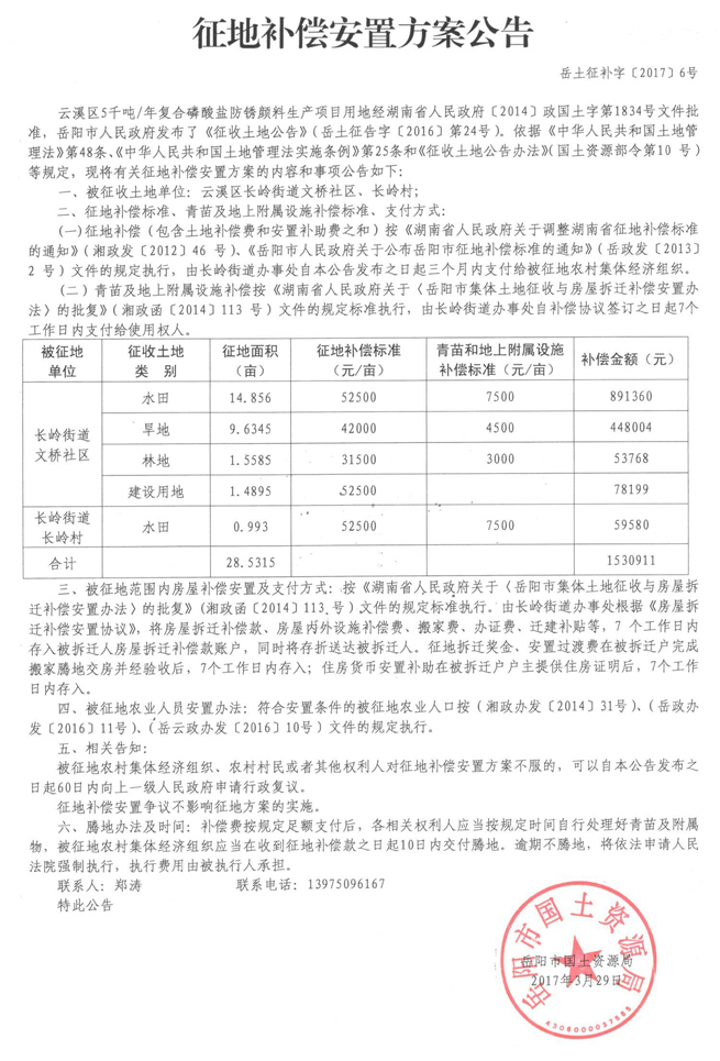 云溪区5千吨/年复合磷酸盐防锈颜料生产项目征地补偿安置方案公告〔2017〕6号