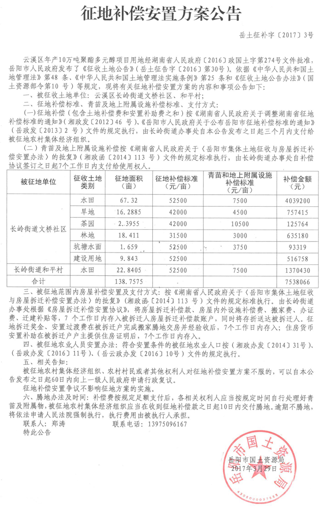 云溪区年产10万吨聚酯多元醇项目安置补偿方案公告〔2017〕3号