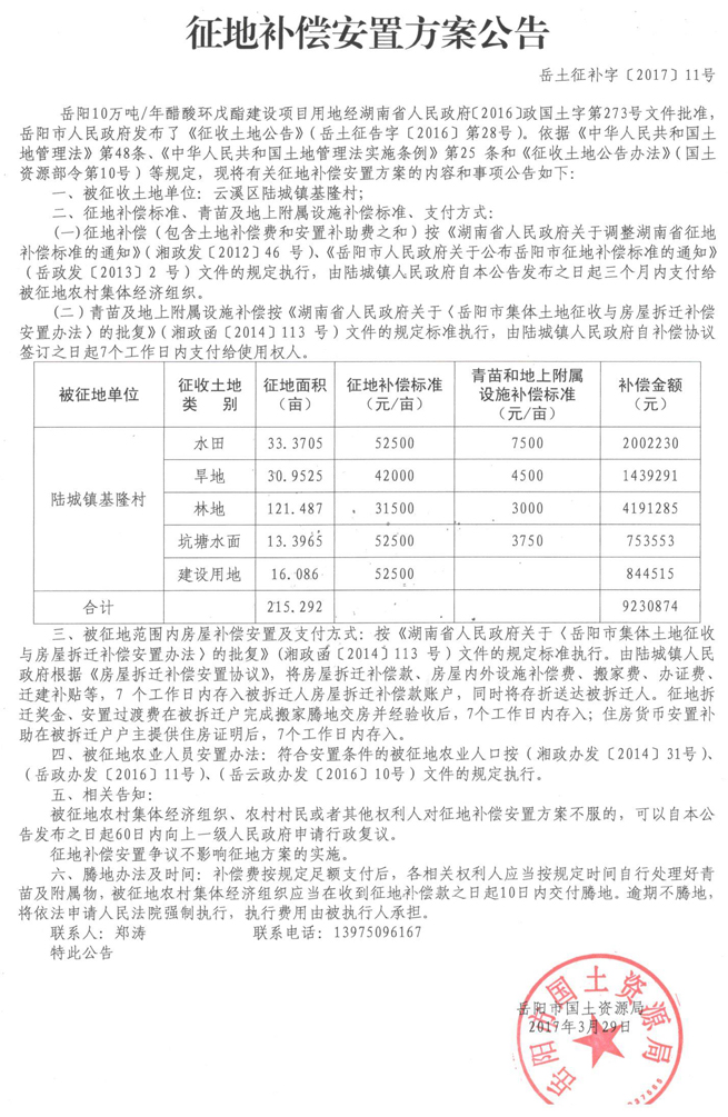 岳阳10万吨/年醋酸环戊酯建设项目征地补偿安置方案公告〔2017〕11号