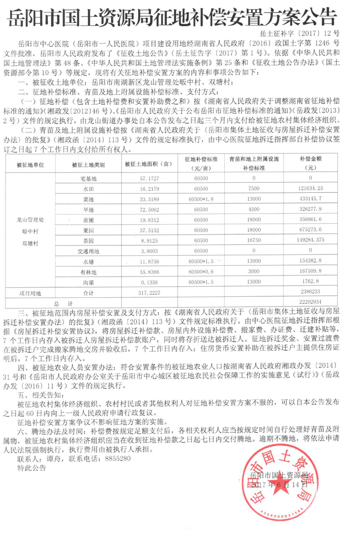 岳阳市中心医院(岳阳市一人民医院)项目安置方案公告〔2017〕12号