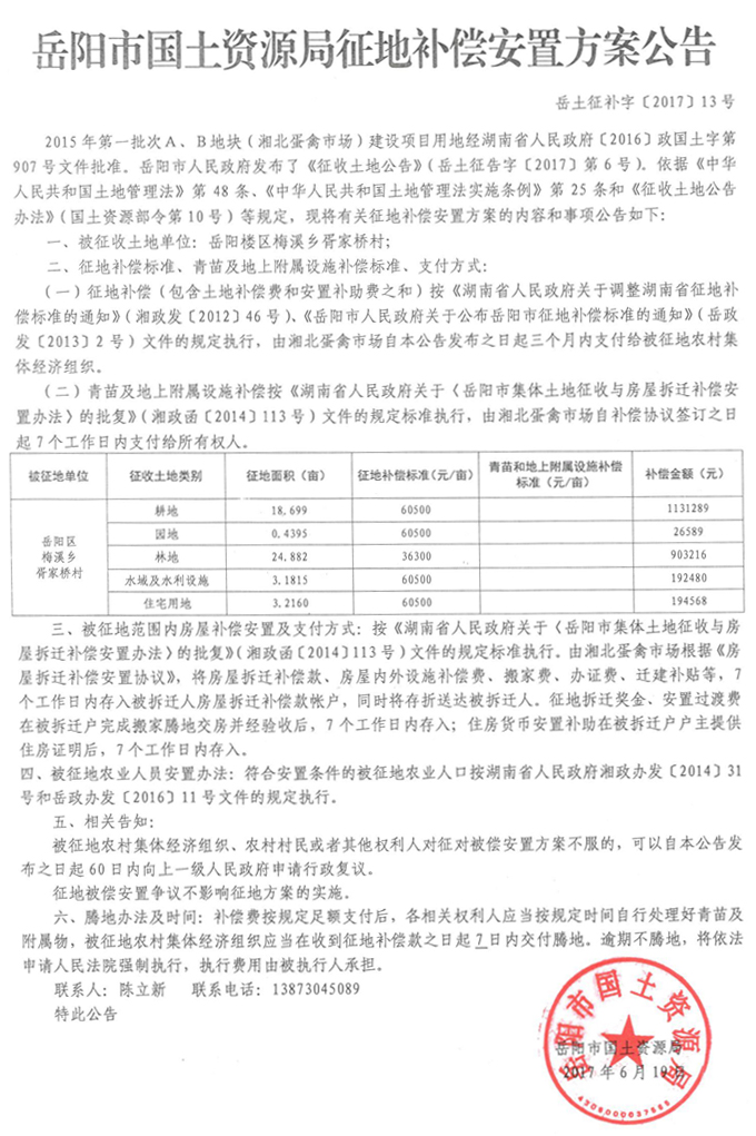 2015年第一批次A、B地块(湘北蛋禽市场)项目安置方案公告〔2017〕13号