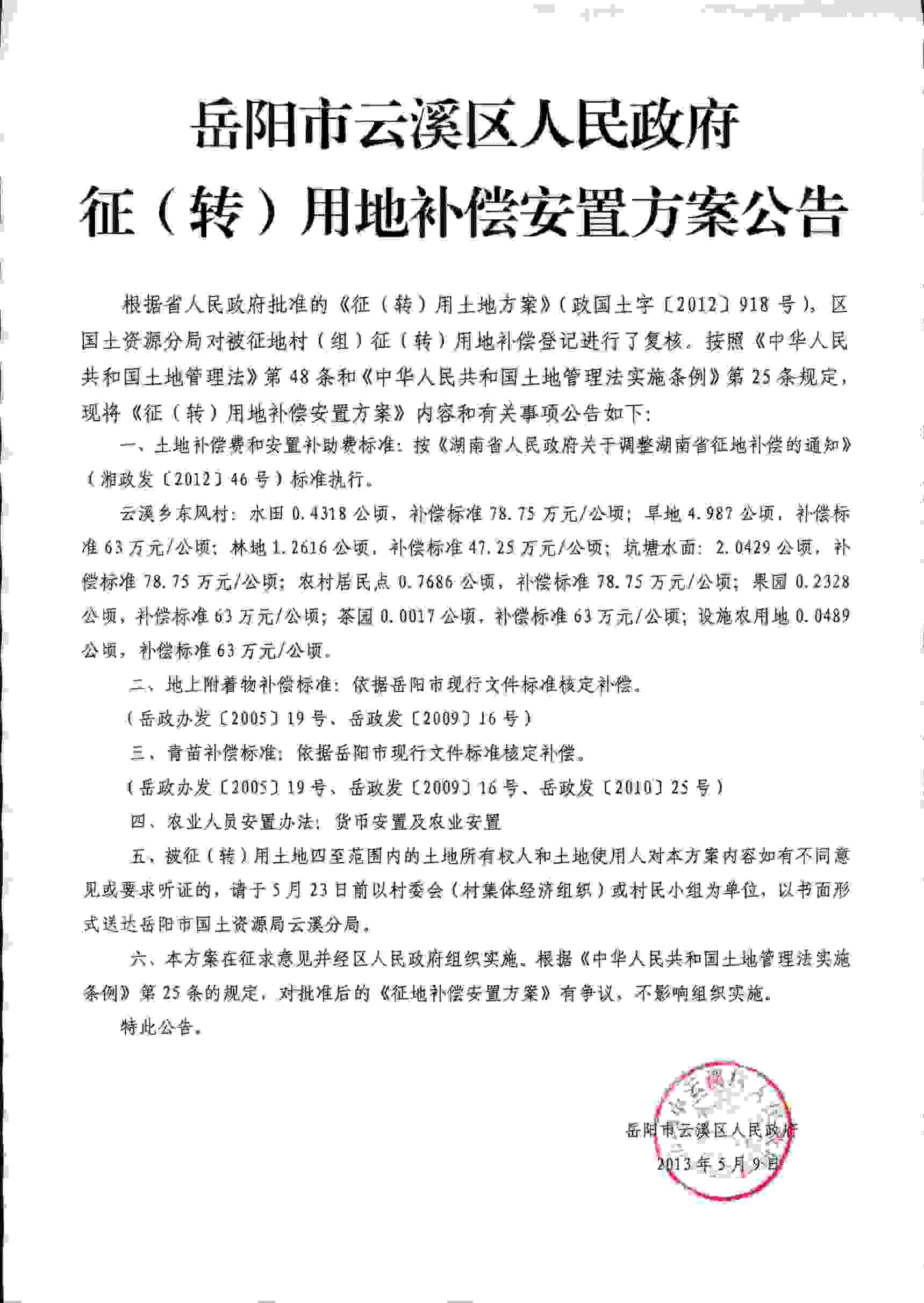 岳阳市云溪区人民政府征(转)用地补偿安置方案公告|云溪乡东风村
