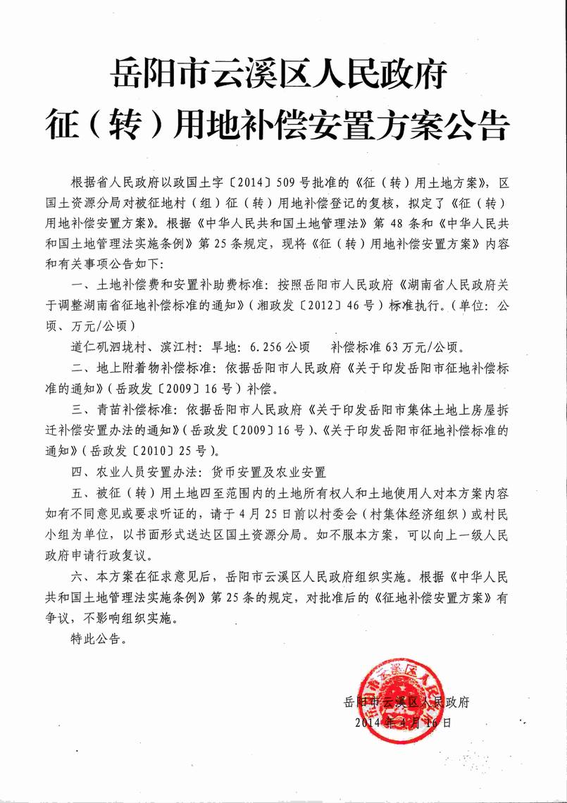 岳阳市云溪区人民政府征(转)用地补偿方案公告|道仁矶泗农村、滨江村