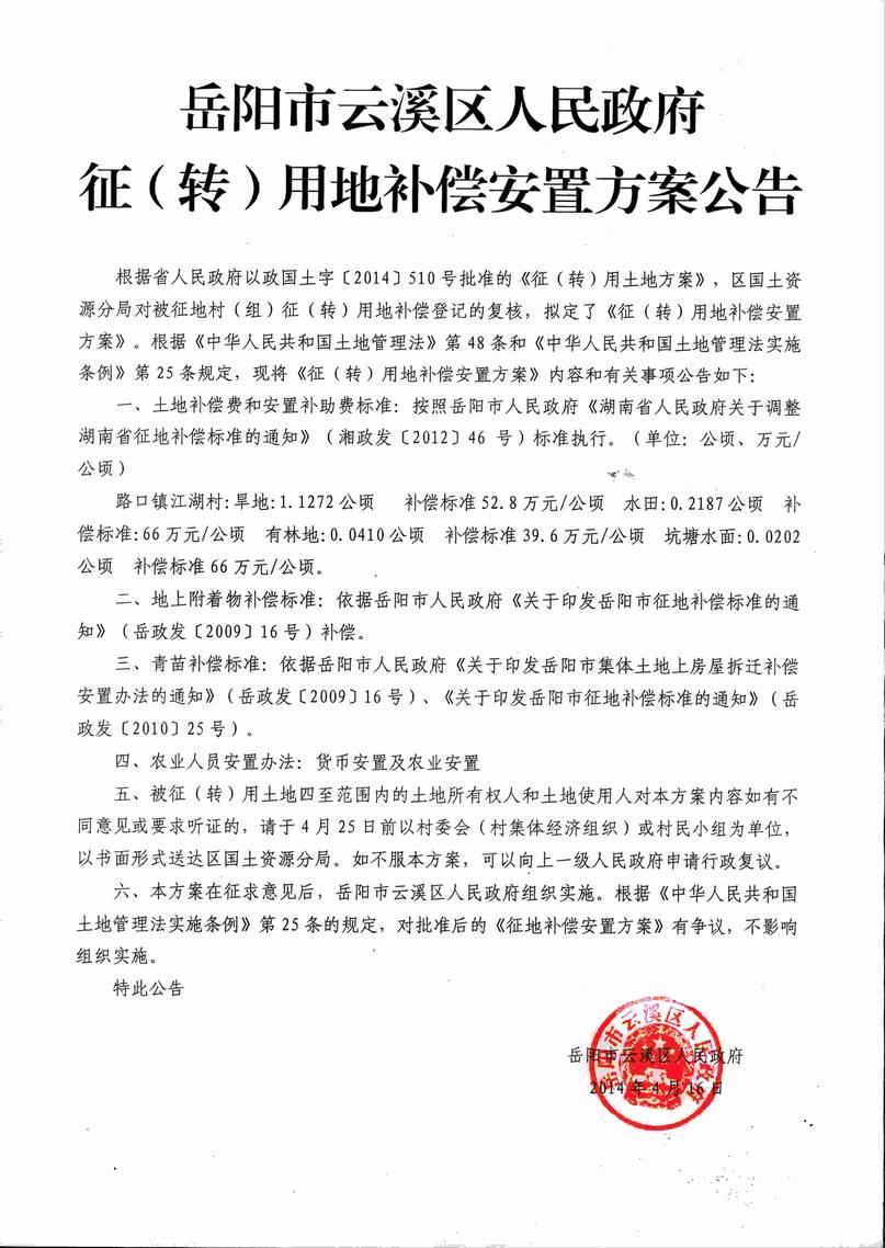 岳阳市云溪区人民政府征(转)用地补偿方案公告|路口镇江湖村