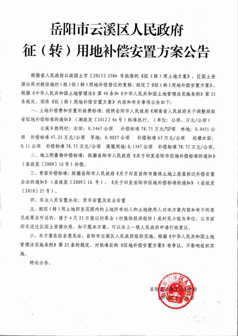 岳阳市云溪区人民政府征(转)用地补偿方案公告|云溪乡胜利村