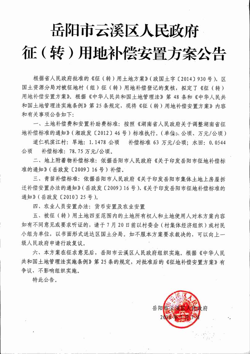 岳阳市云溪区人民政府征(转)用地补偿方案公告|道仁矶滨江村