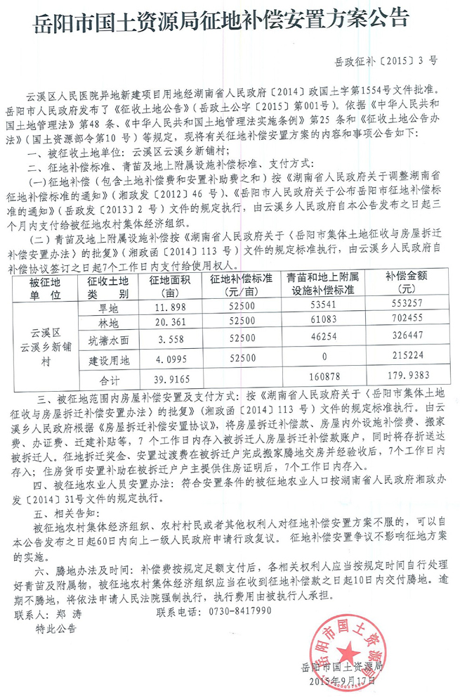 岳阳市国土资源局征地补偿安置方案公告|岳政征补〔2015〕03号