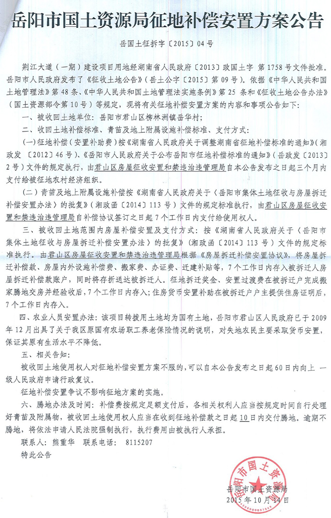 岳阳市国土资源局征地补偿安置方案公告|岳国土征拆字〔2015〕04号