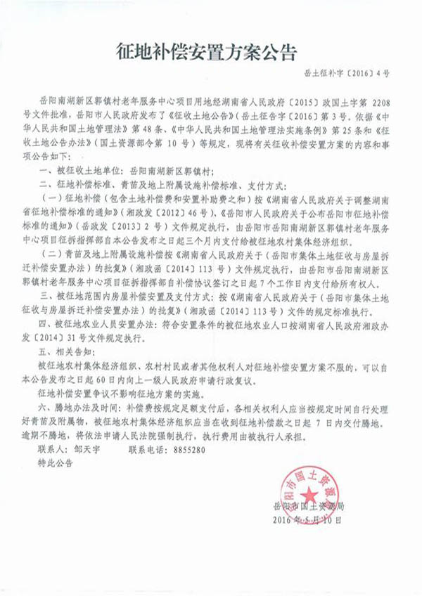 岳阳市国土资源局征地补偿安置方案公告|岳土征补字〔2016〕4号