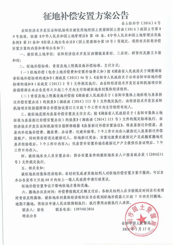 岳阳市国土资源局征地补偿安置方案公告|岳土征补字〔2016〕6号