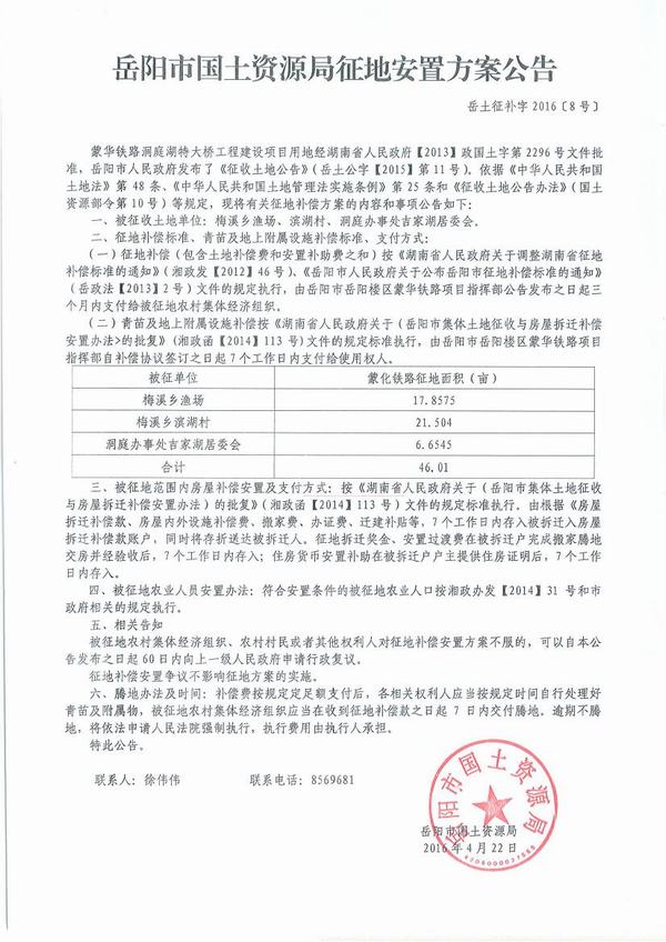 岳阳市国土资源局征地补偿安置方案公告|岳土征补字〔2016〕8号