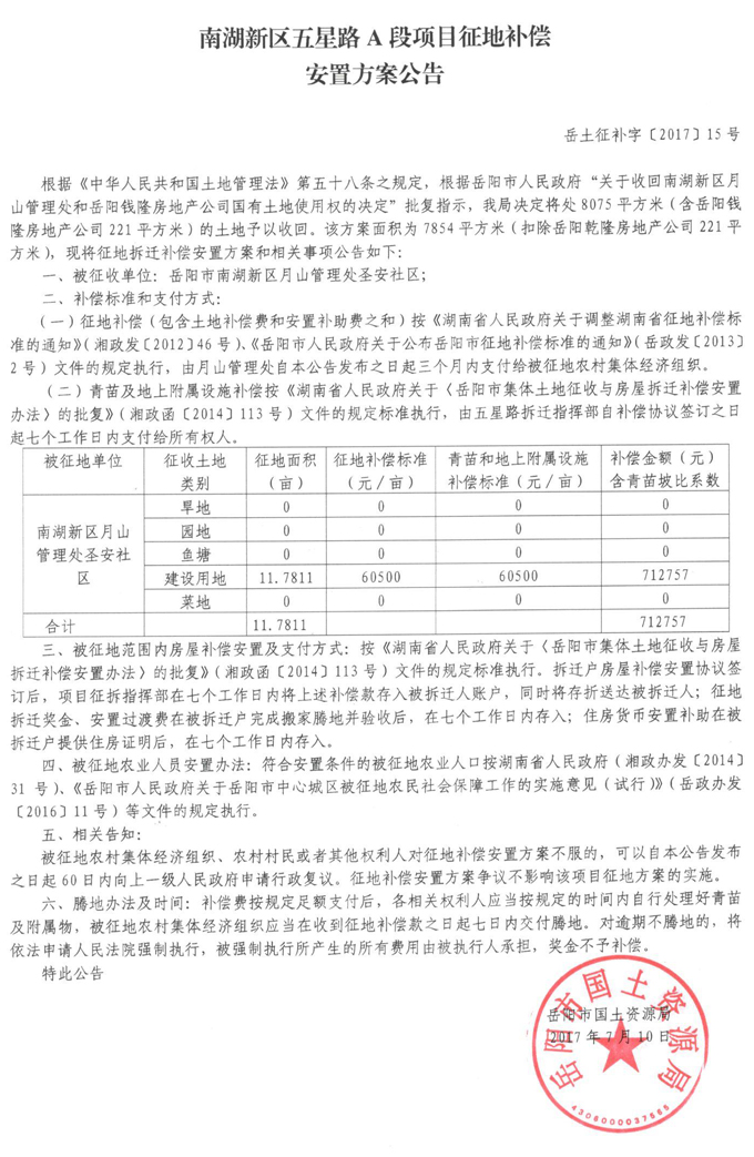 南湖新区五星路A段项目安置方案公告〔2017〕15号