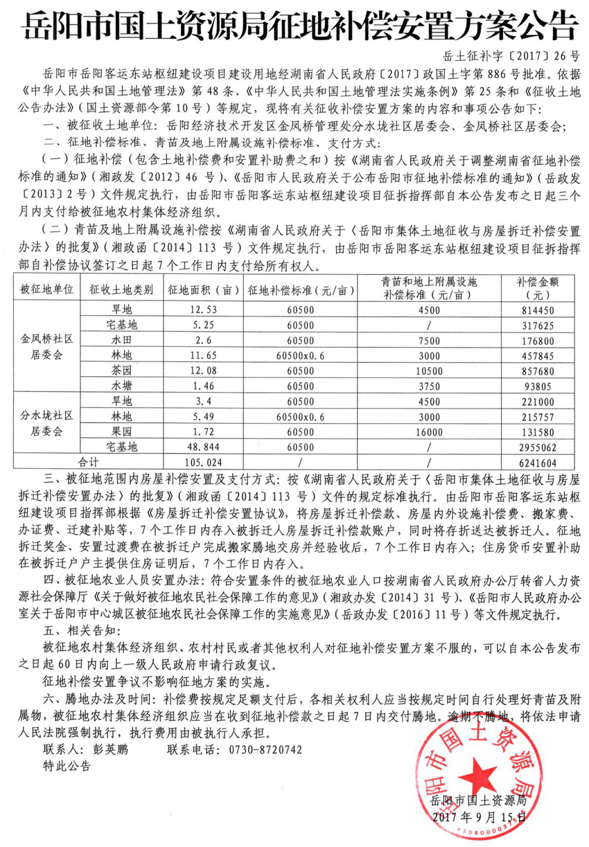 岳阳市岳阳客运东站枢纽建设项目征地补偿安置方案公告(2017)26号
