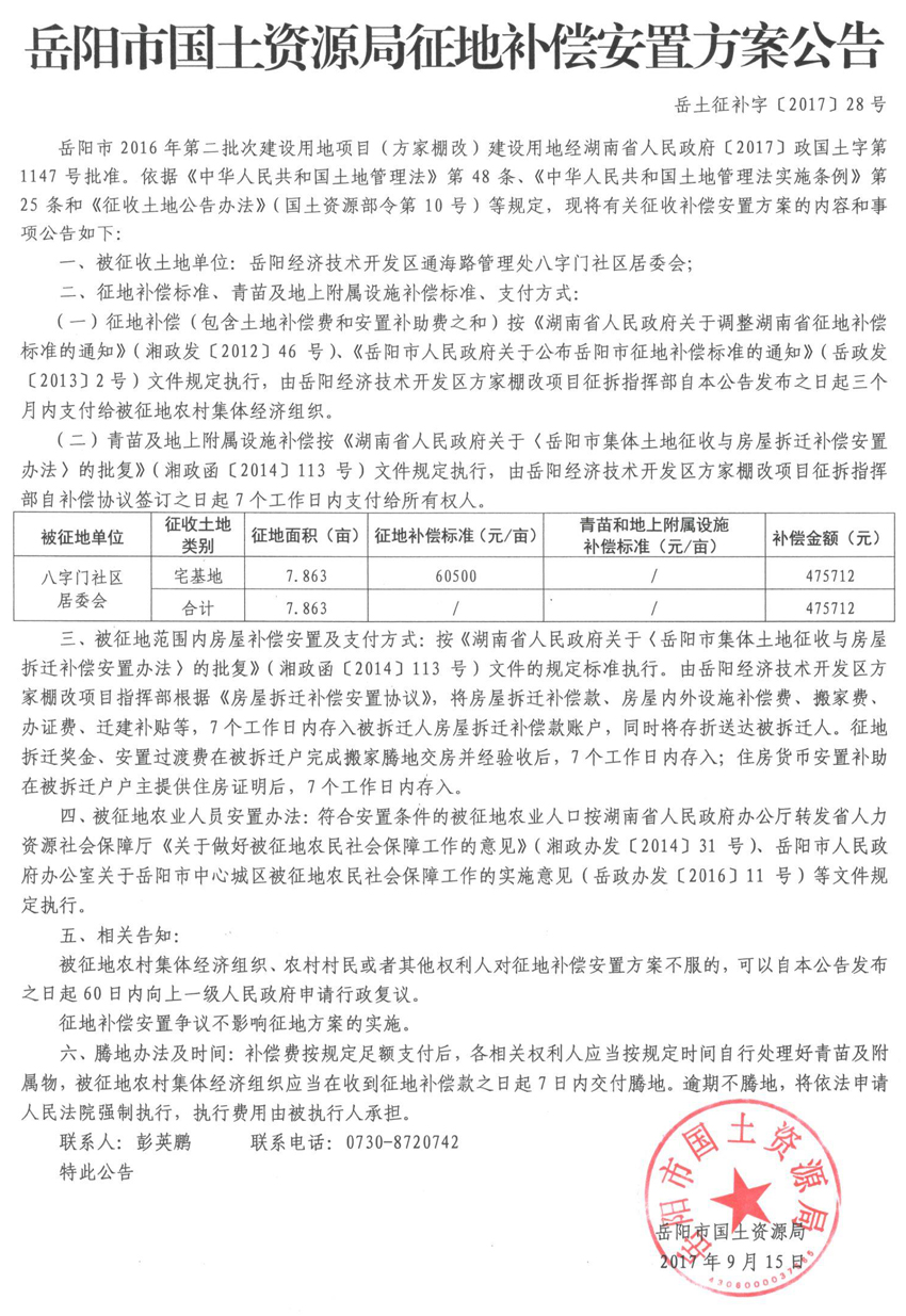 岳阳市2016年第二批次建设用地(方家棚改)项目征地补偿安置方案公告(2017)28号