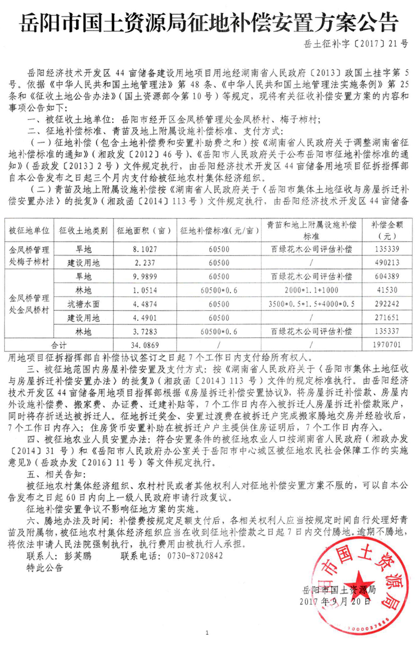 岳阳经济技术开发区44亩储备用地项目征地补偿安置方案公告(2017)21号