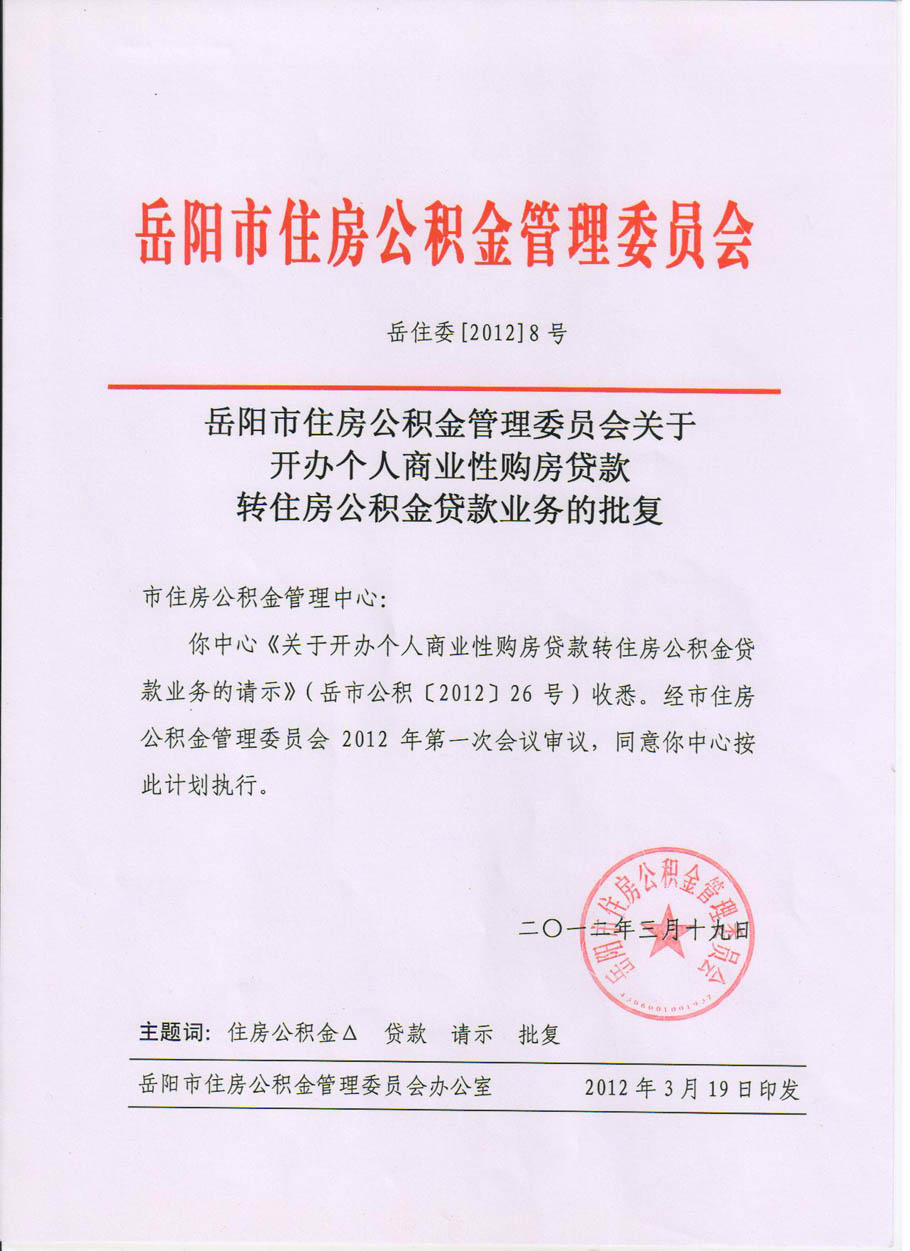 岳阳市住房公积金管理委员会关于开办个人商业性购房贷款转住房公积金贷款业务的批复