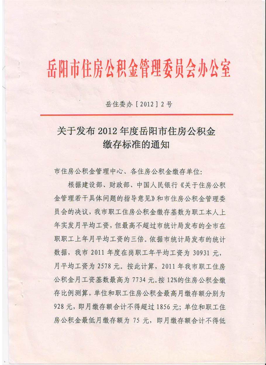 关于发布2012年度岳阳市住房公积金缴存标准的通知