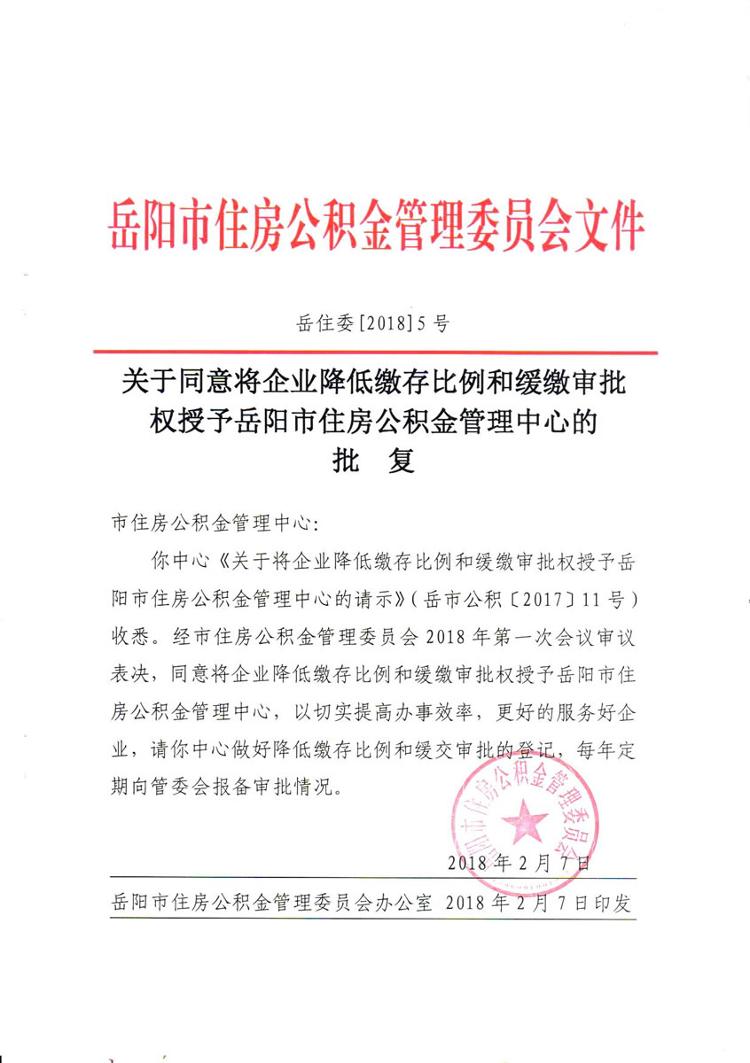 关于同意将企业降低缴存比例和缓缴审批权授予岳阳市住房公积金管理中心的批复