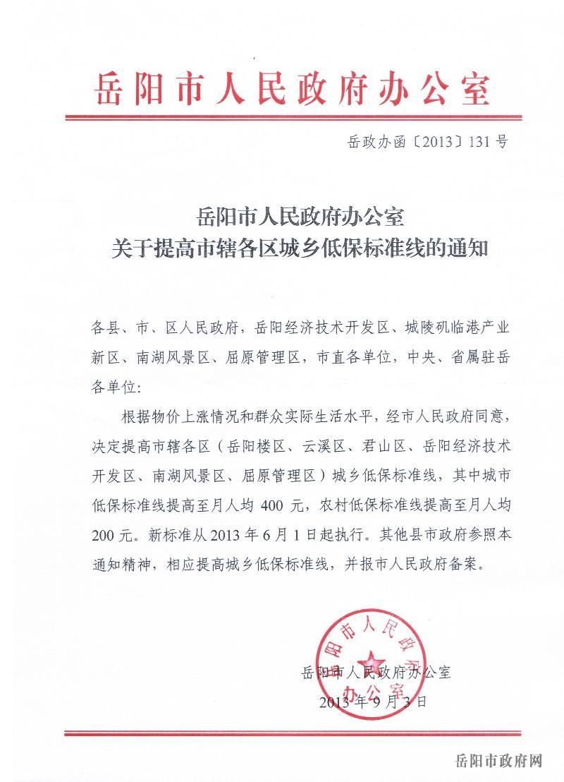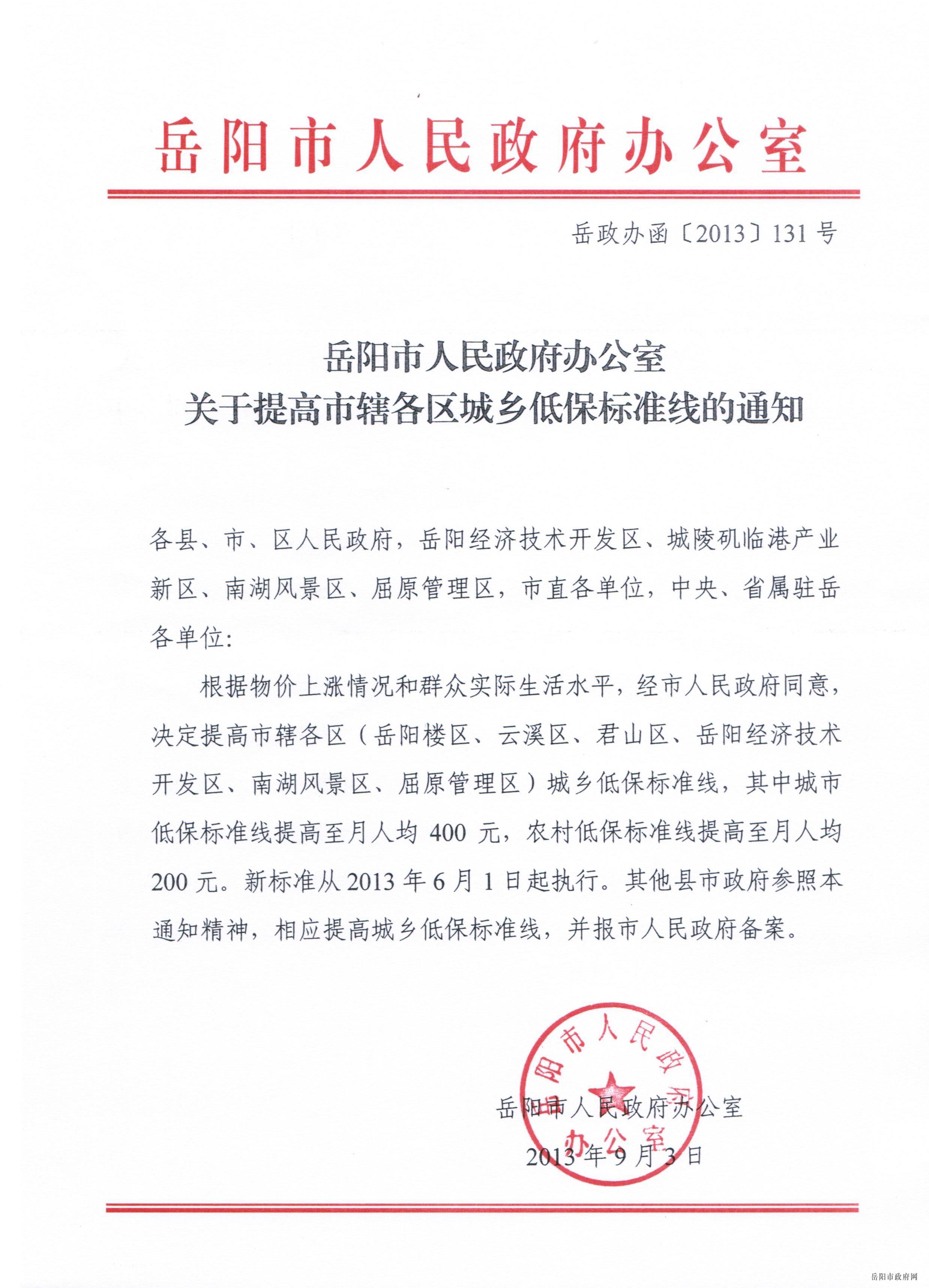 岳阳市人民政府办公室关于提高市辖各区城乡低保标准线的通知