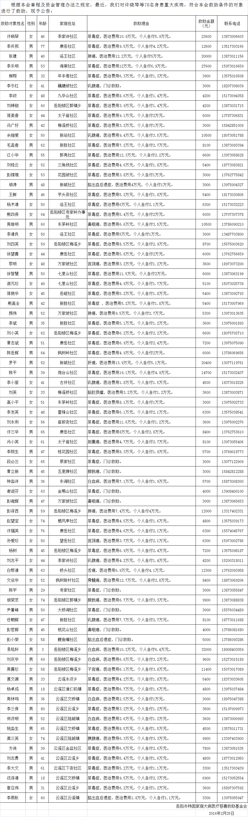 2016年岳阳市特困家庭大病医疗慈善救助基金会救助对象公告(二)