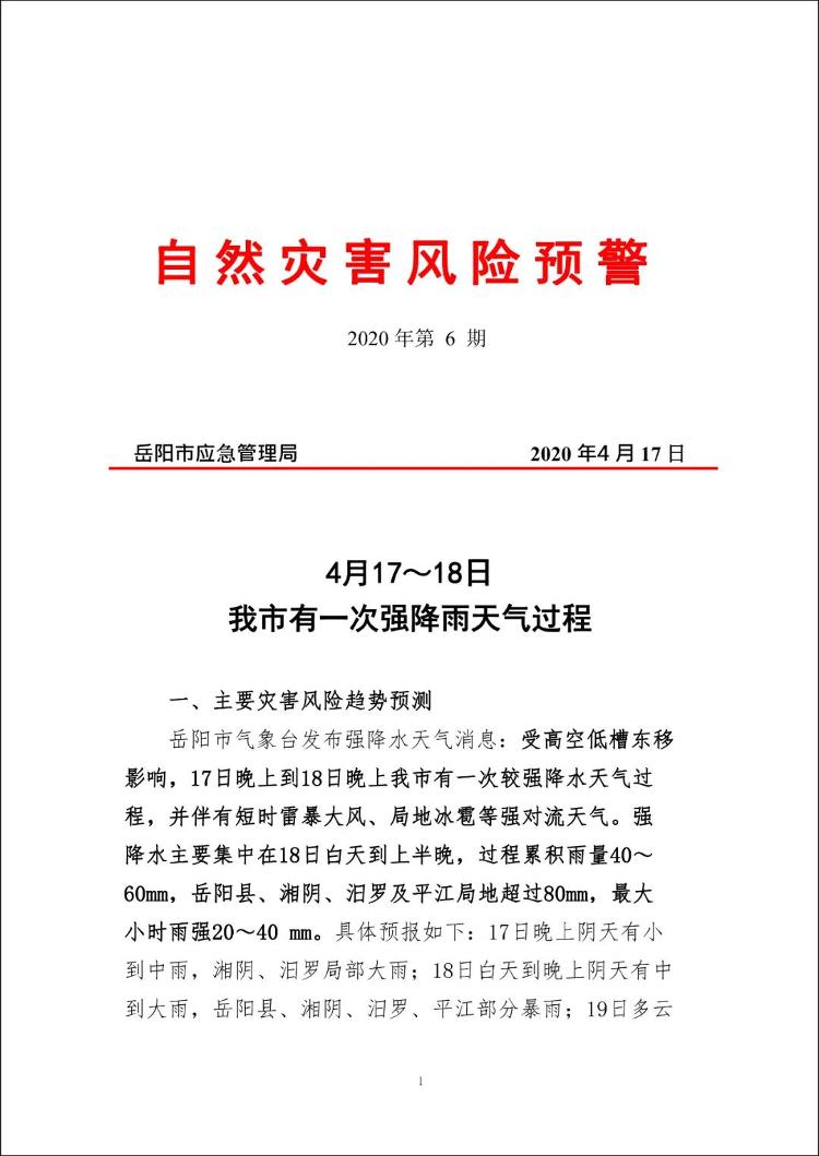 自然灾害风险预警2020年第6期 /今明两天,我市有一次强降雨天气过程