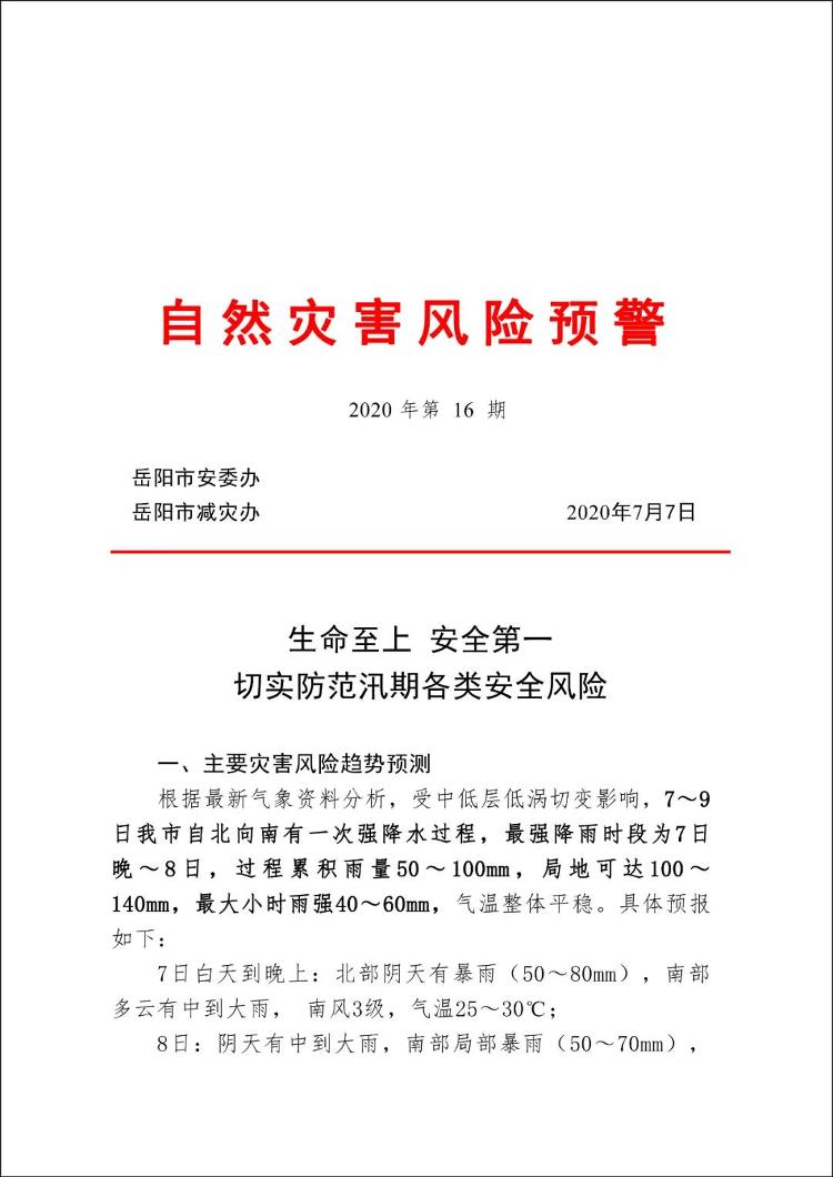 自然灾害风险预警2020年第16期/生命至上 安全第一 切实防范汛期各类安全风险