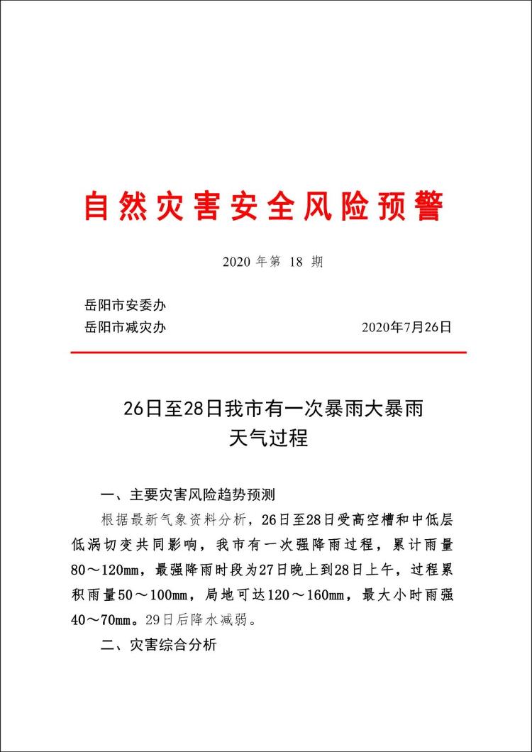 自然灾害安全风险预警2020年第18期/提醒!26日至28日我市有一次暴雨大暴雨天气过程