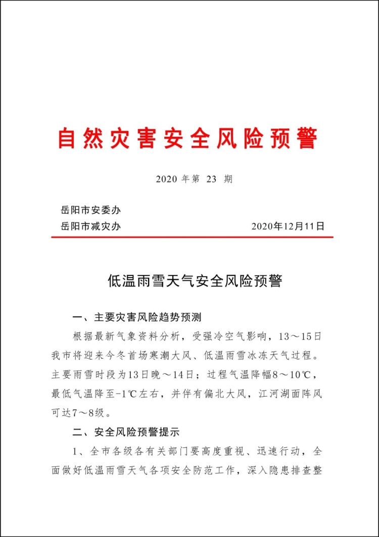 自然灾害安全风险预警2020年第23期/今冬第一场雪马上要来了!请务必保障安全!