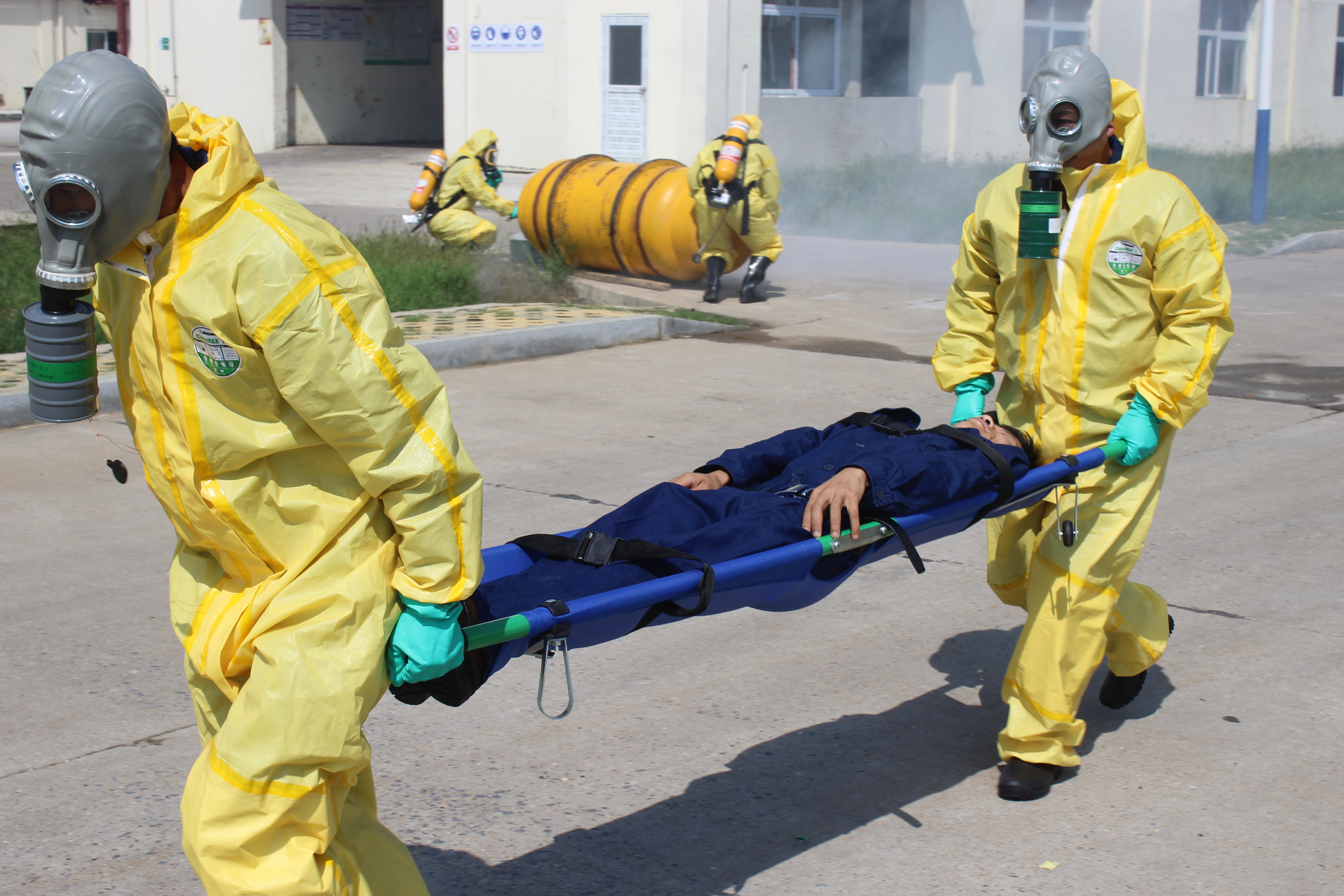 据悉,今年6月份是全国第14个“安全生产月”,临湘市安委会组织开展了咨询日、警示教育、知识竞赛等系列活动,这次事故救援应急演练是“安全生产月”活动重要的环节。演练由临湘市安监局牵头,临湘市工业园、环保、卫生、消防等部门协同配合,主要检验临湘市危险化学品事故应急预案的科学性、针对性和实用性,检验企业危险化学品事故的应急处置能力,不断提高临湘市安全生产应急救援工作的总体水平。演练分为事故报警、应急处置、现场处置和救援结束等四个内容,参与演练人员达70人。演练假设了湖南比德生化科技有限公司戊炔草氨车间液氨缓冲罐区氨气大量泄漏场景,随着指挥长一声令下,现场设立了安全警戒、现场抢险、医疗救护等7个小组,按照预案,有条不紊各司其职。半小时后,总指挥报告“现场危险源已经消除……抢险救援成功,符合应急终止条件。”