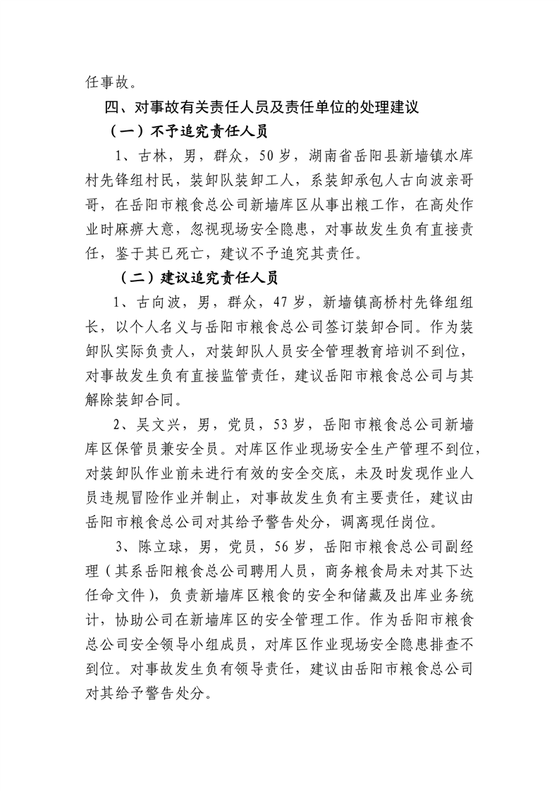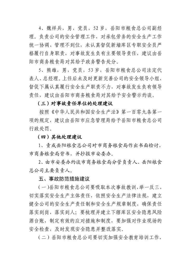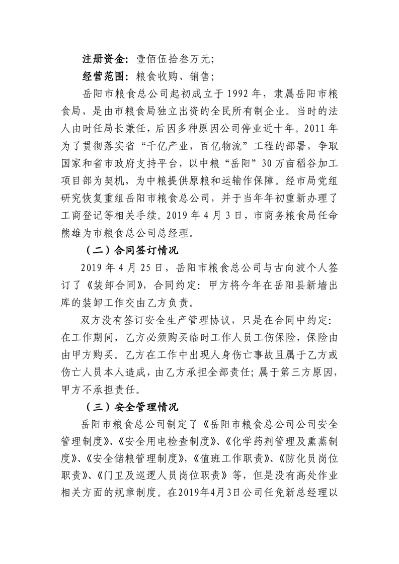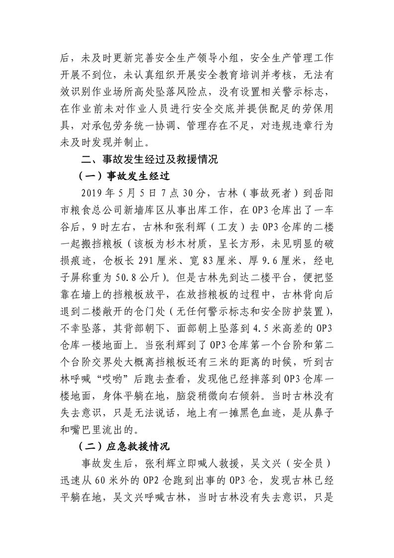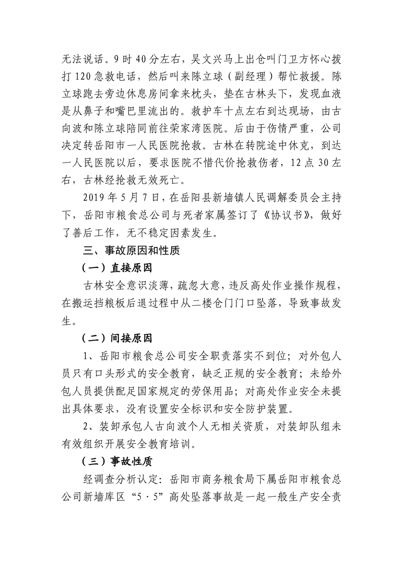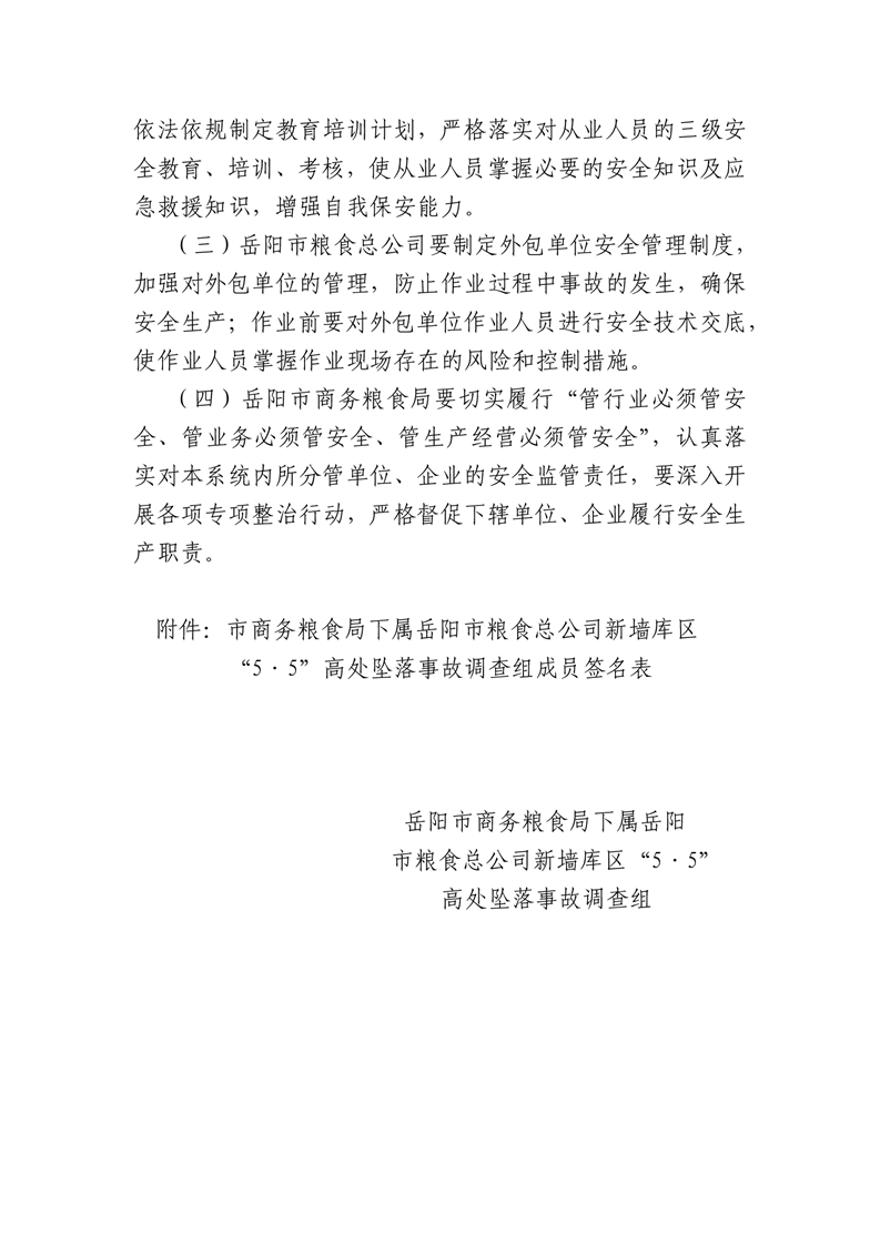 岳阳市商务粮食局下属岳阳市粮食总公司新墙库区“5·5”高处坠落事故调查报告