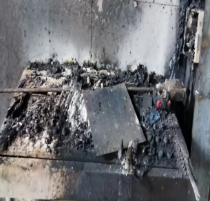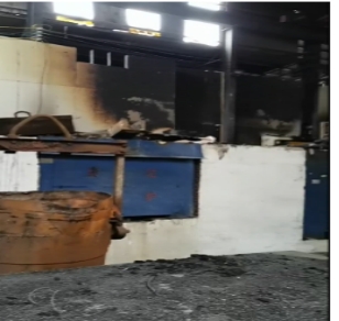 事故炉整体结构未发生大的变化,在炉台上控制台烧毁,现场电源开关及线路烧毁。东侧墙壁有明显过火痕迹,炉前模具、行车吊控制器有烧焦现场。