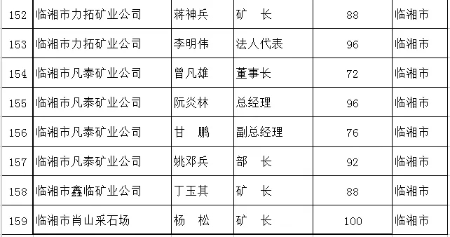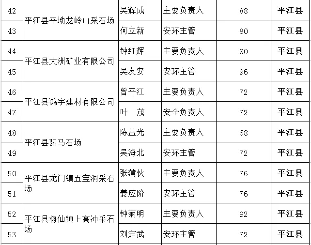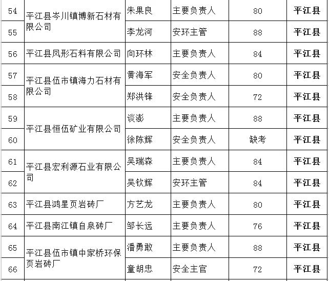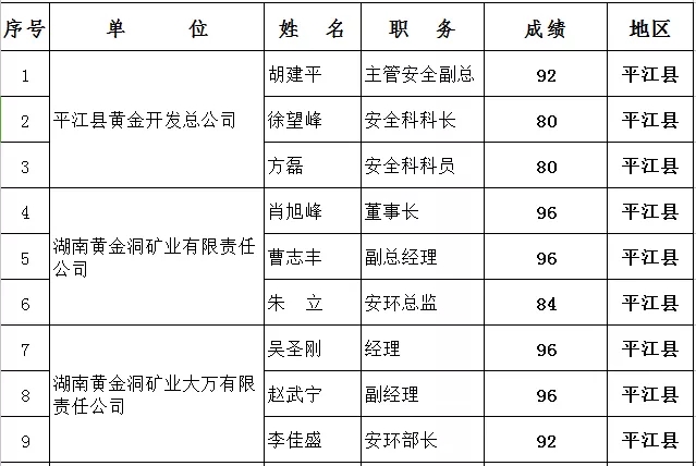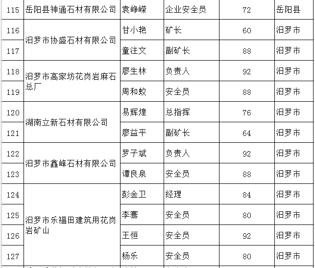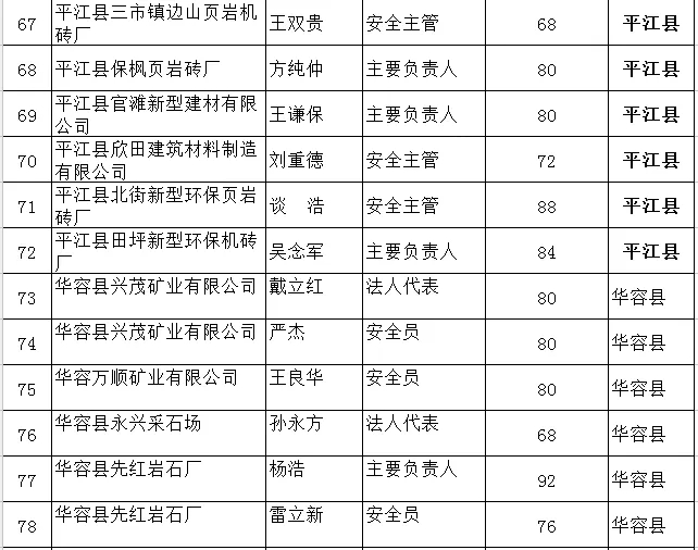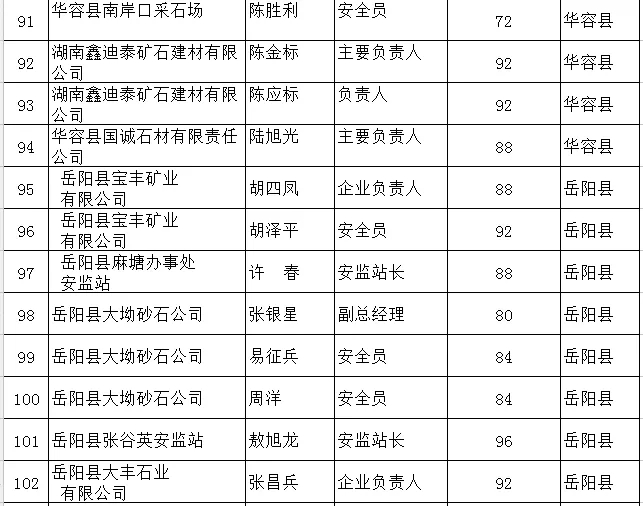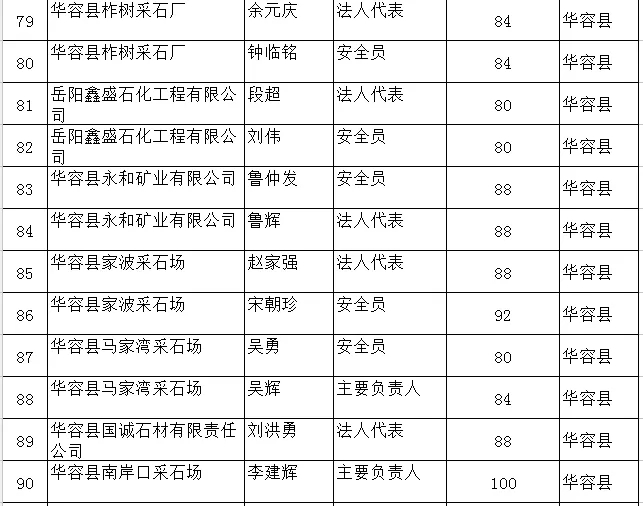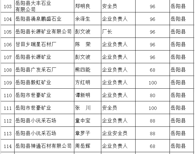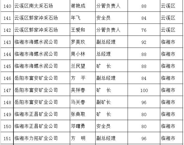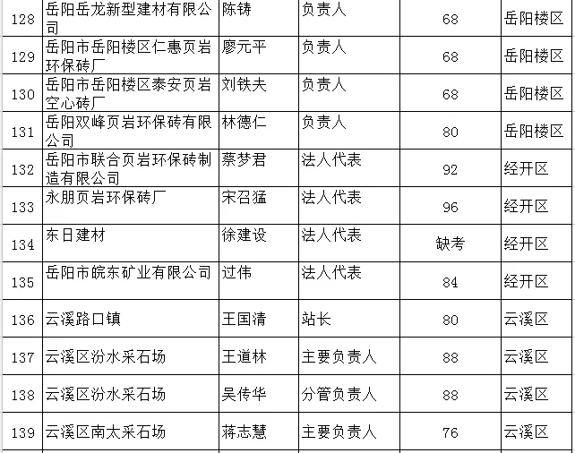 11月8日,市安监局举办全市非煤矿山安全管理培训班,培训结束后,组织全市100余家非煤矿山企业(含建设企业)主要负责人、安全管理人员就安全生产应知应会知识进行集中考试,现将成绩公布如下: