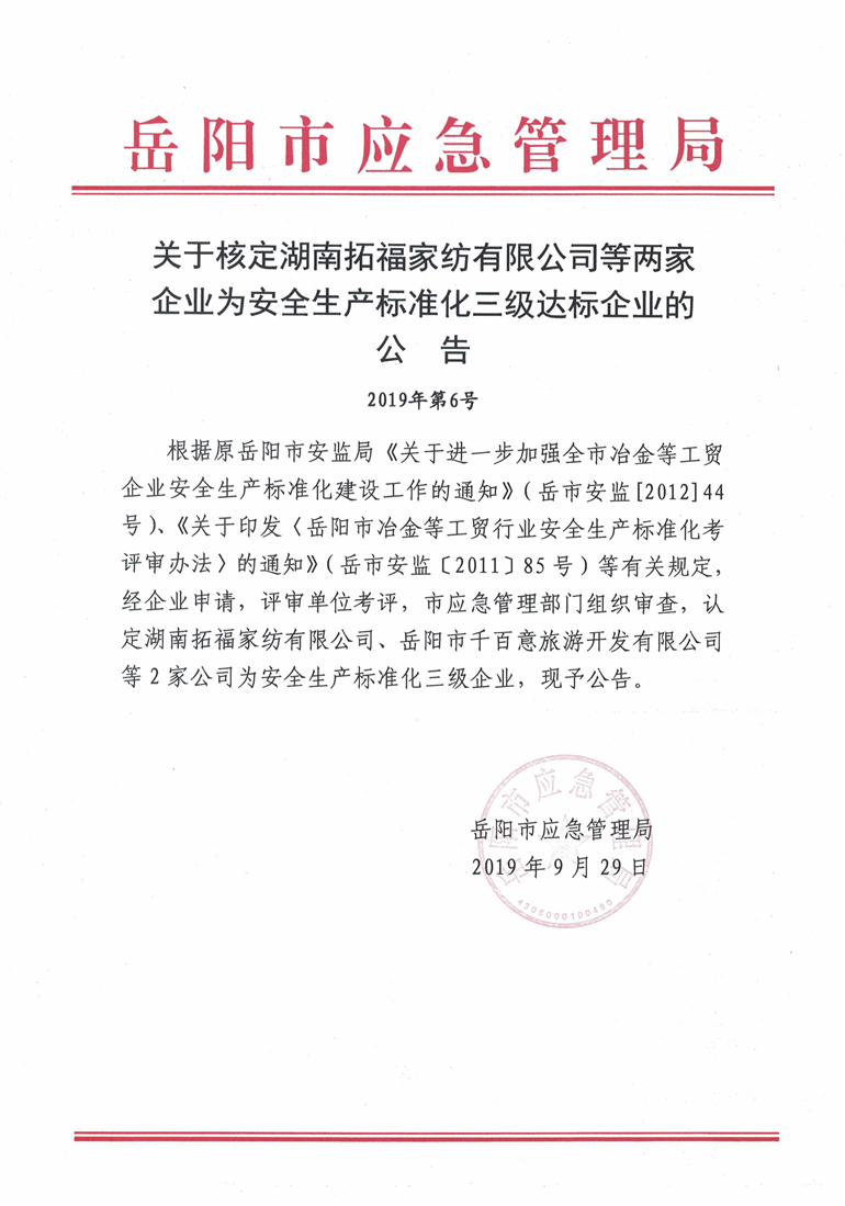 关于核定湖南拓福家纺有限公司等两家企业为安全生产标准化三级达标企业的公告