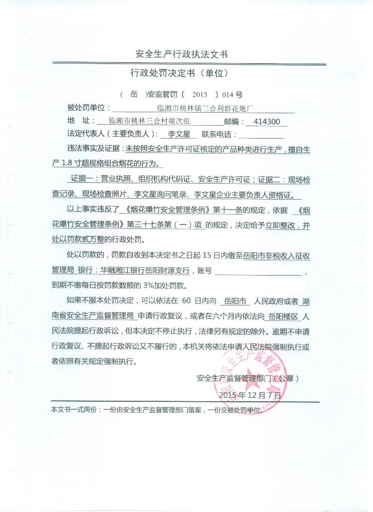 对临湘市桃林镇三合利群花炮厂的行政处罚决定